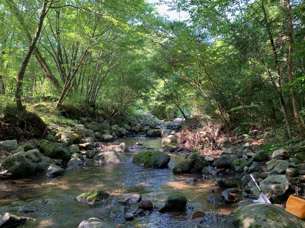 サイトの目の前から川に降りられます。この川が、これまた素晴らしい雰囲気で。釣竿持って先へ進みたい欲望が。おじさんの中の野生が目覚める、そんな風景です。薄めにコーヒーを入れてマグカップを川の水にさらしておくと結構すぐ冷えて、アイスコーヒーが飲めます。