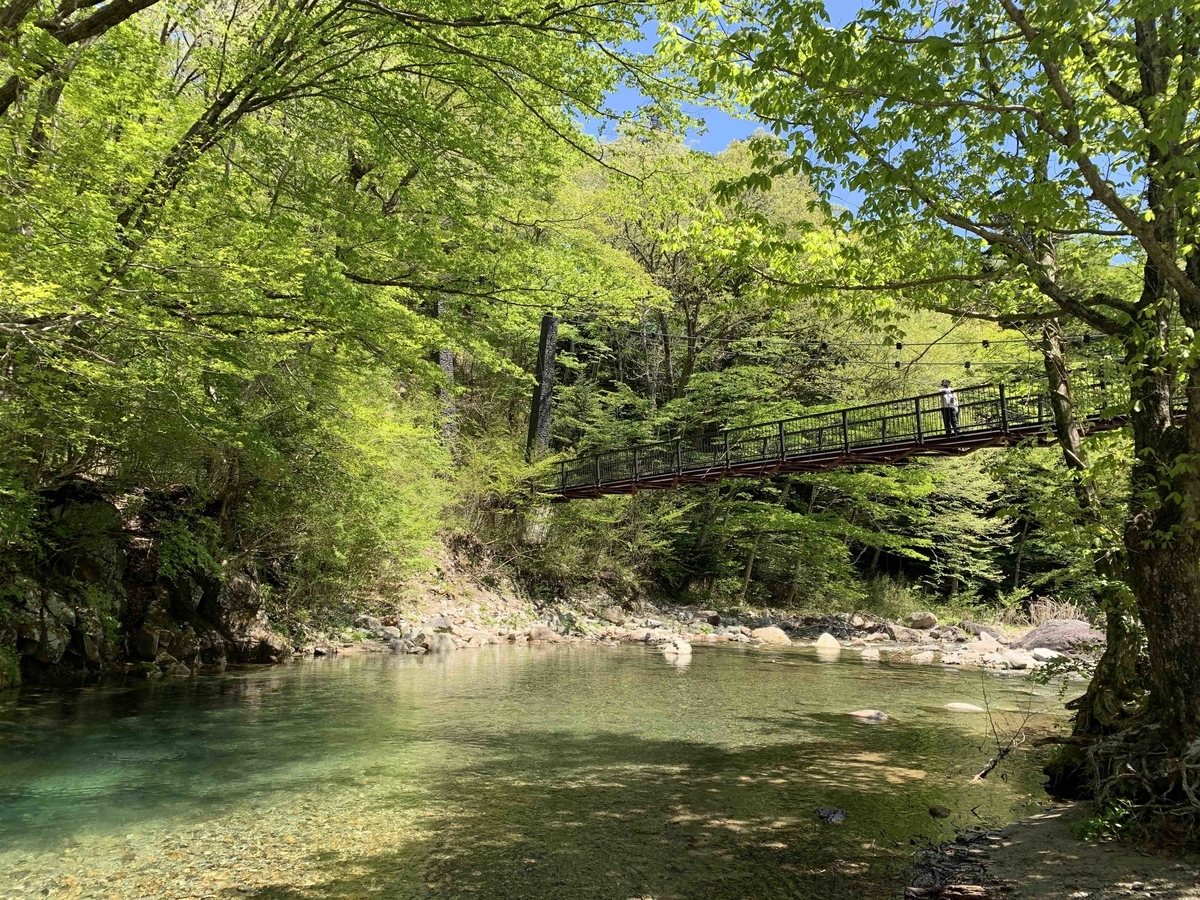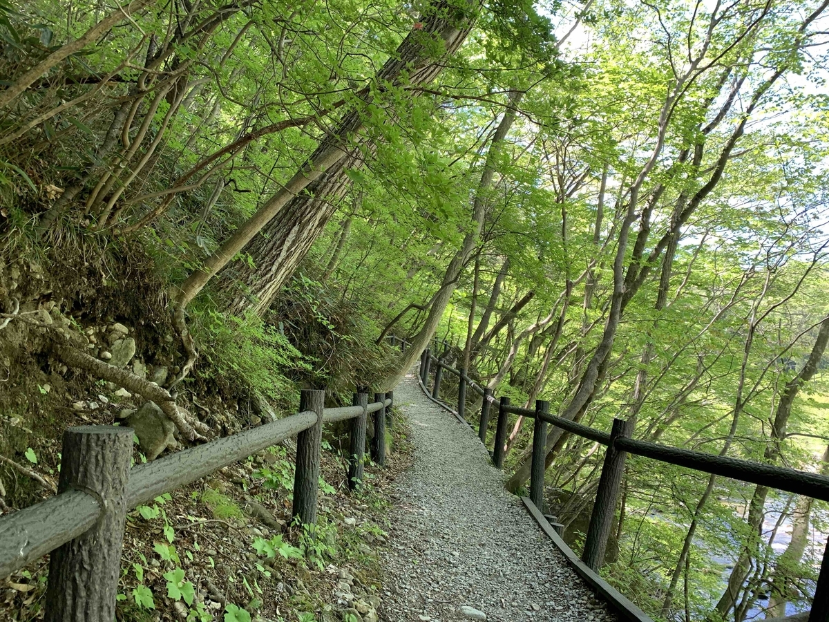 吊り橋を渡ると熊がいそうな森の中。ところどころ川を眺められるスポットがあります。新緑と青空と水の色が絶妙。下の写真の深い瀞を過ぎると水流を離れ斜面沿いの遊歩道になります。道幅は広いですが柵などはないので小さいお子さんは注意。遊歩道の終点は車道に合流となりますので飛び出さないように。